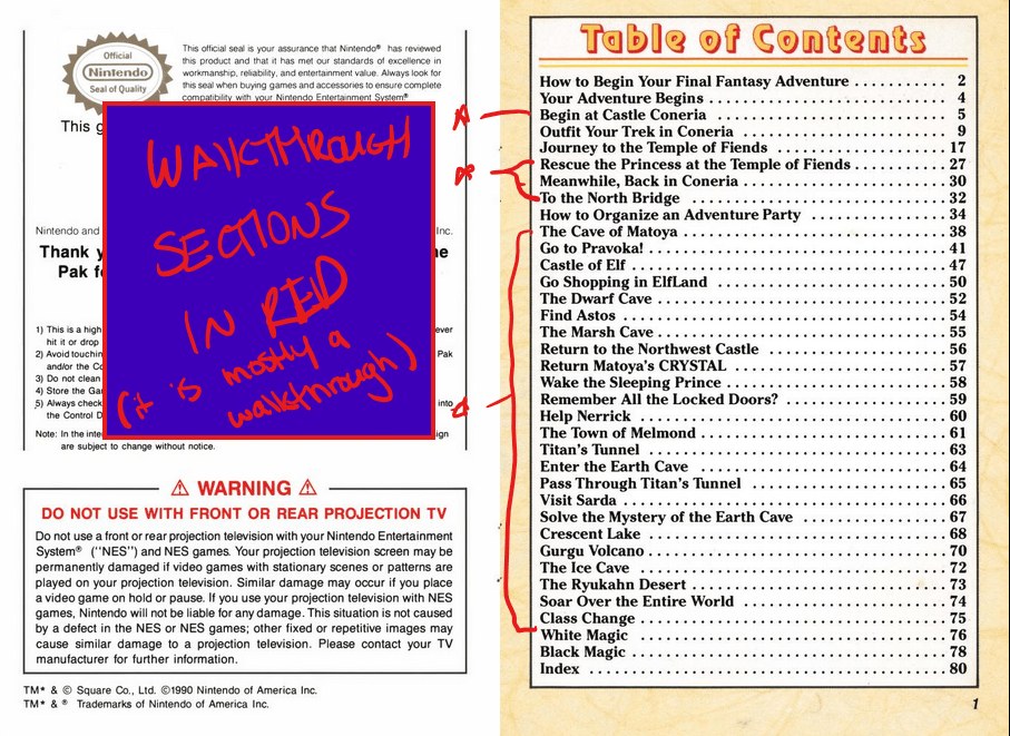 Did it tell you how to beat the game? No. But it doesn't leave you to your own devices until you've gotten the airship, which makes exploring nearly trivial because you aren't being constantly interrupted by random encounters. To add insult to injury, once I scrolled to the bottom of the PDF file, I found it also came with what appear to be 4 posters (I'm gonna guess they were double-sided) that provided: