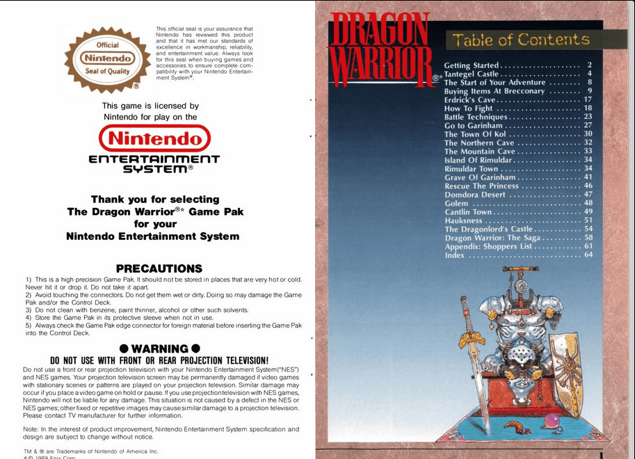 That said, there is a lot going on in old RPGs that the era's technology was maybe not able to fully support. Out of curiosity, I also checked out the original manual for Dragon Quest (aka Dragon Warrior) and found the same thing: a lot of detailed information about equipment and mechanics, and its own walkthrough for a decent chunk of the game.